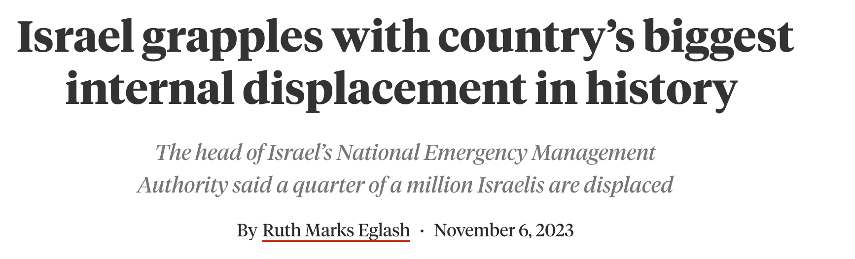 We could be living in the South near Gaza, or in the North near Lebanon. Hundreds of thousands of Israelis from those areas have been evacuated —the sanitized term is “internally displaced”. Refugees in a land of refugees.