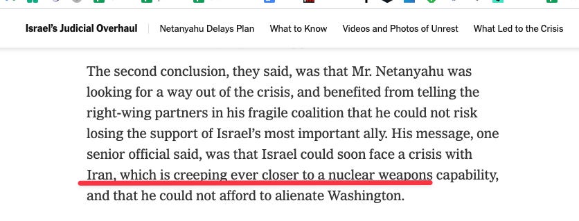 It’s from a big New York Times story Inside the U.S. Pressure Campaign Over Israel’s Judicial Overhaul in which US officials told Prime Minister Netanyahu that Israel’s image as the sole democracy in the Middle East was at stake.